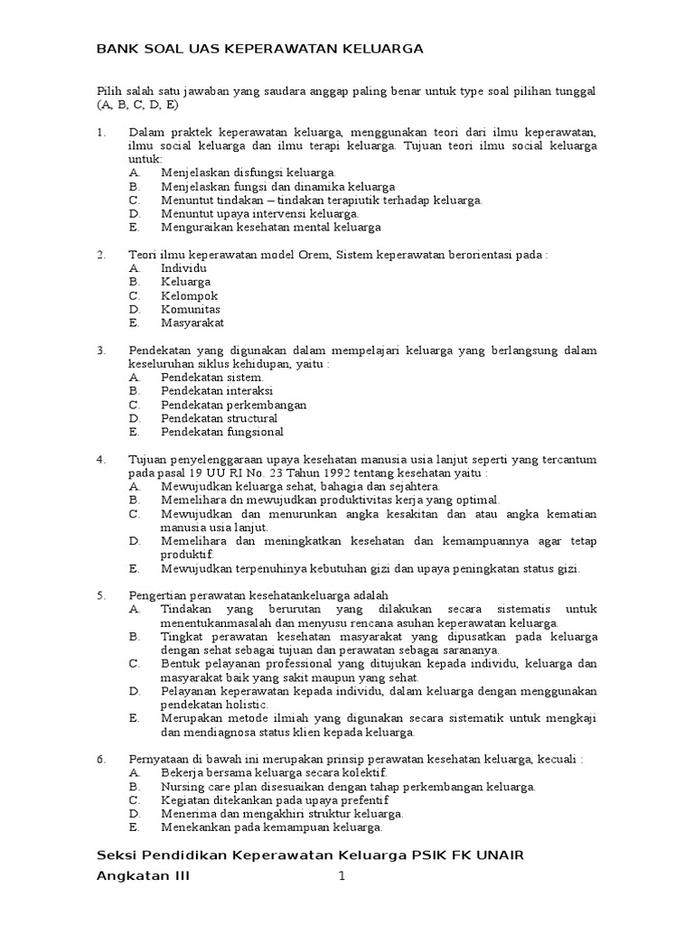 Soal Uts Keperawatan Keluarga Dan Jawaban / Pembahasan Soal Keperawatan Keluarga Youtube / Contoh soal uji kompetensi keperawatan medikal bedah dan kunci jawaban.. Seorang perawat keluarga telah memberikan tindakan berupa pendidikan. 40 soal tentang seo jawabannya pilihan ganda essay demikian contoh soal uts gasal mata pelajaran penataan produk dan kunci jawaban smk kelas xii bisnis daring dan pemasaran bdp. Mengidentifikasi tanda dan gejala, penyebab, dan akibat isolasi sosial c. Pertanyaan dalam penerapan promosi kesehatan pada keluarga, tindakan manakah yang sebaiknya dilakukan perawat? Saunders 360 review untuk ukni (edisi 1) terbitan 2016 oleh tim asosiasi institusi pendidikan ners indonesia (aipni) yang diadaptasi dari buku comprehensive review for the nclex.